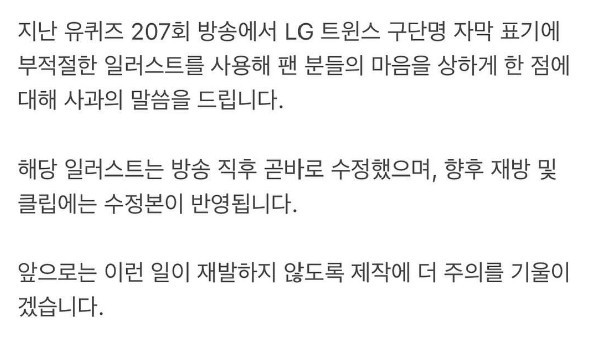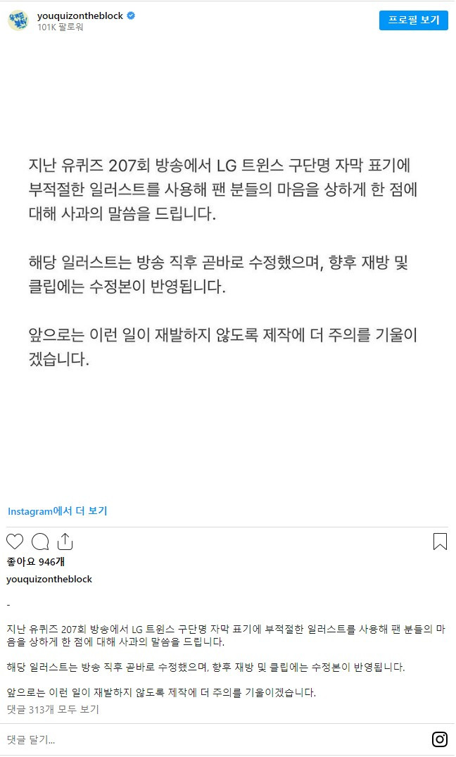 유퀴즈 공식 인스타 사과문 업로드