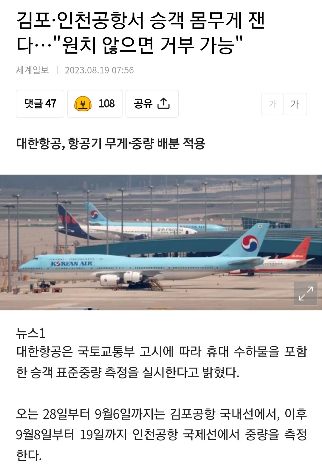 김포,인천공항서 승객 몸무게 잰다, 원치 않으면 거부가능