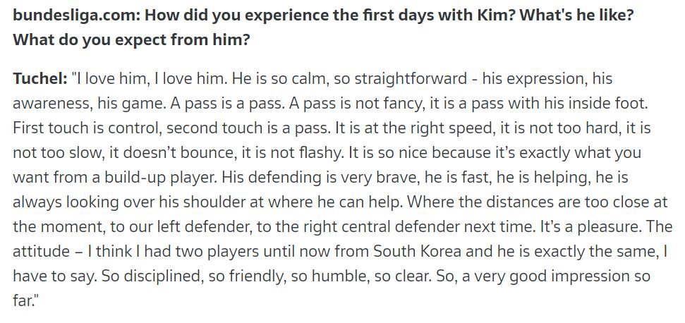 투헬 : 난 김민재를 사랑한다. 그는 아주 침착하고, 그의 표현, 인지능력, 경기운영은 직설적이다.