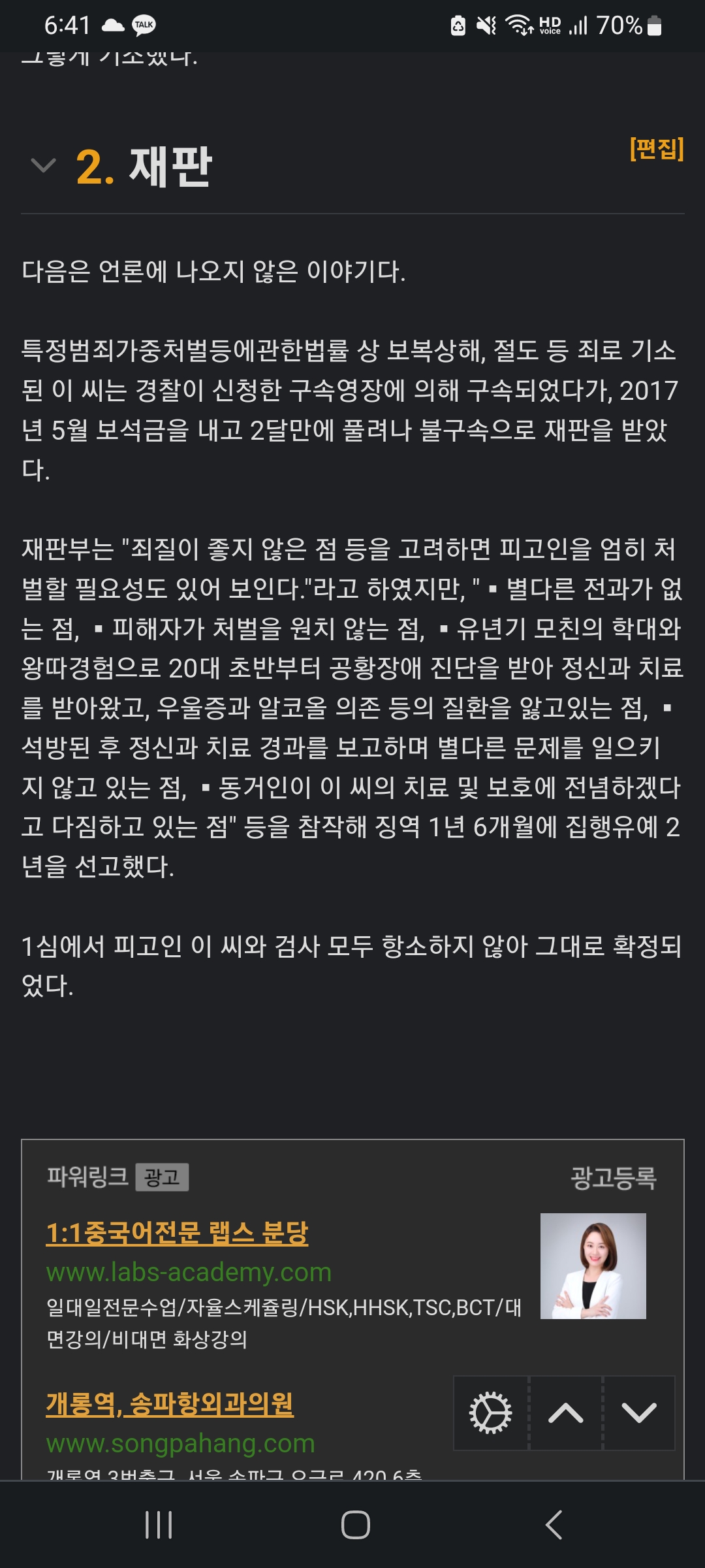 재판부는 "죄질이 좋지 않은 점 등을 고려하면 피고인을 엄히 처벌할 필요성도 있어 보인다."라고 하였지만, "▪+별다른 전과가 없는 점, ▪+피해자가 처벌을 원치 않는 점, ▪+유년기 모친의 학대와 왕따경험으로 20대 초반부터 공황장애 진단을 받아 정신과 치료를 받아왔고, 우울증과 알코올 의존 등의 질환을 앓고있는 점, ▪+ 석방된 후 정신과 치료 경과를 보고하며 별다른 문제를 일으키지 않고 있는 점, ▪+동거인이 이 씨의 치료 및 보호에 전념하겠다고 다짐하고 있는 점" 등을 참작해 징역 1년 6개월에 집행유예 2년을 선고했다.
