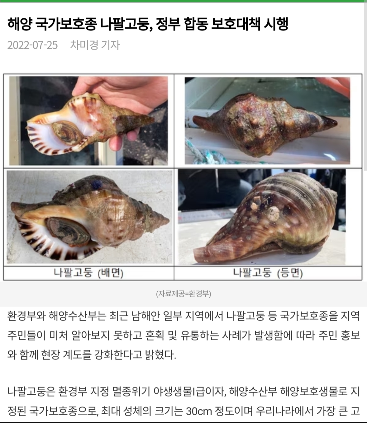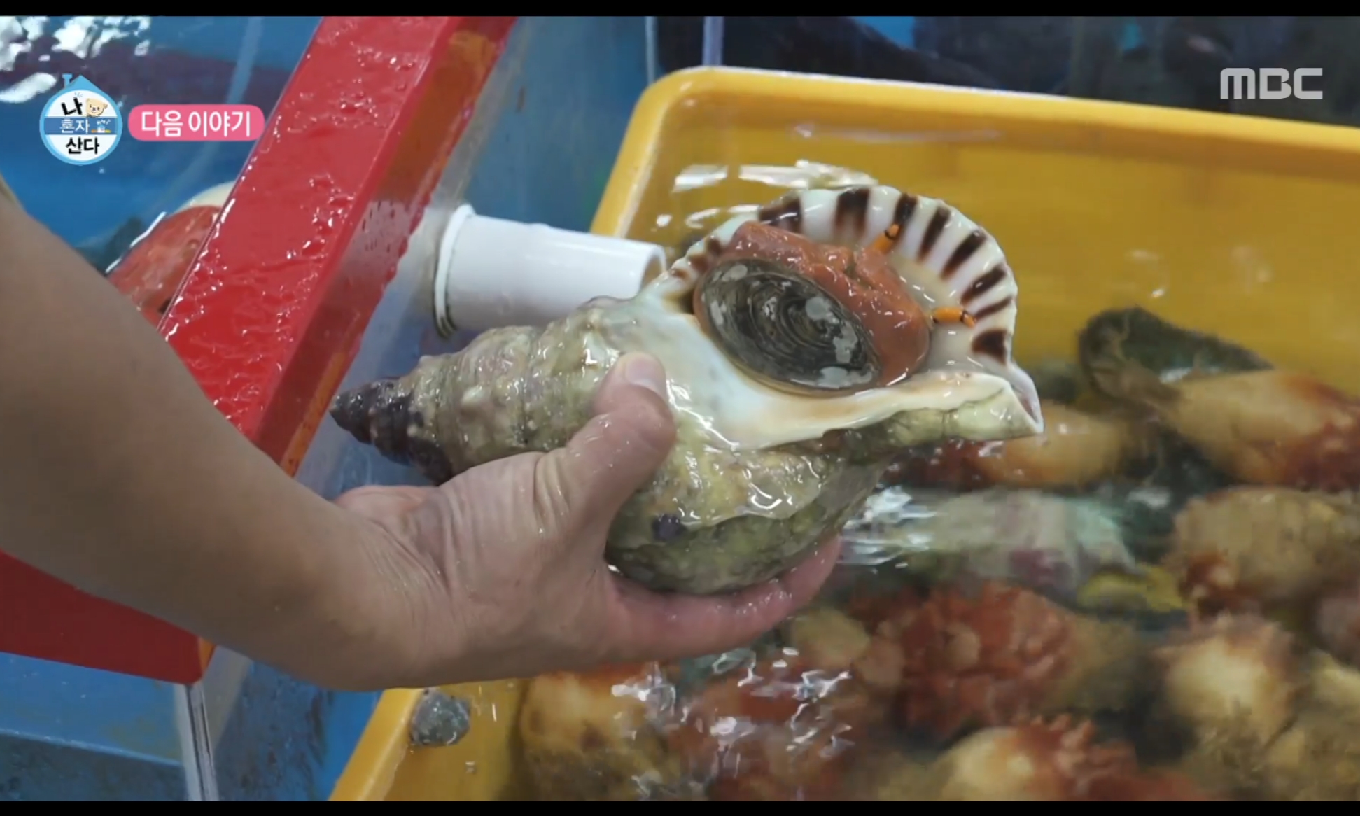 횟집에서 멸종위기 1급 나팔고둥이 횟감으로 버젓이 팔리는 장면 나옴.
