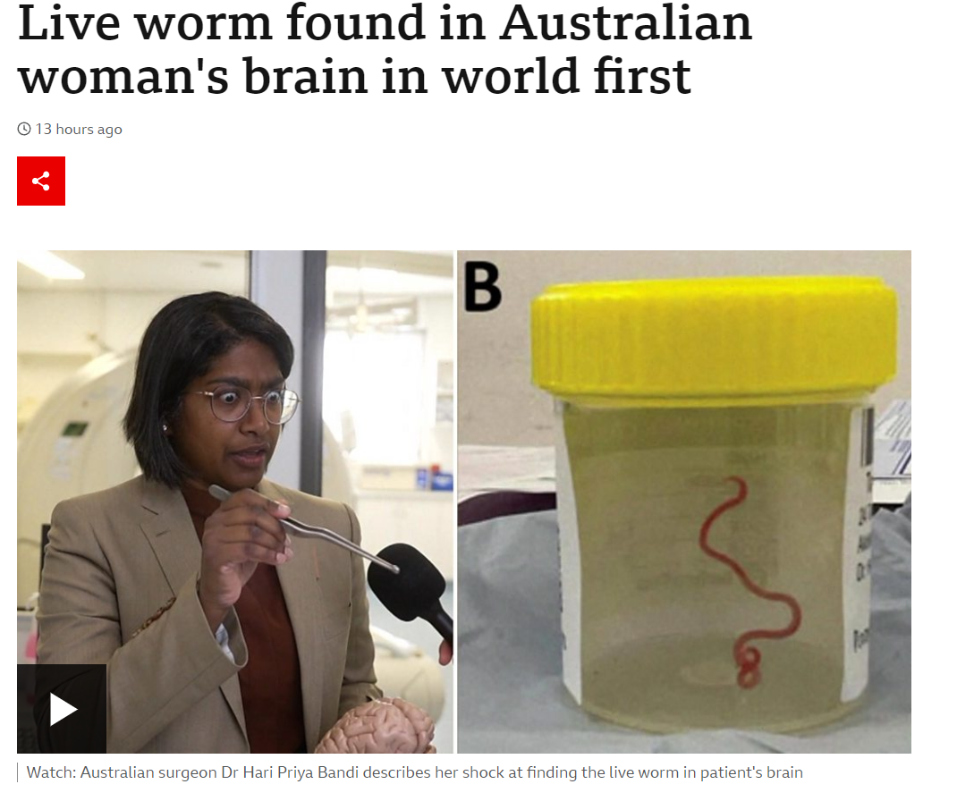호주에서 세계최초로 인간의뇌에서 살아있는기생충을 발견하고 제거했습니다.