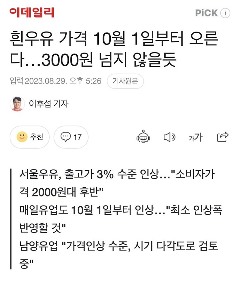 우유 가격 인상예정