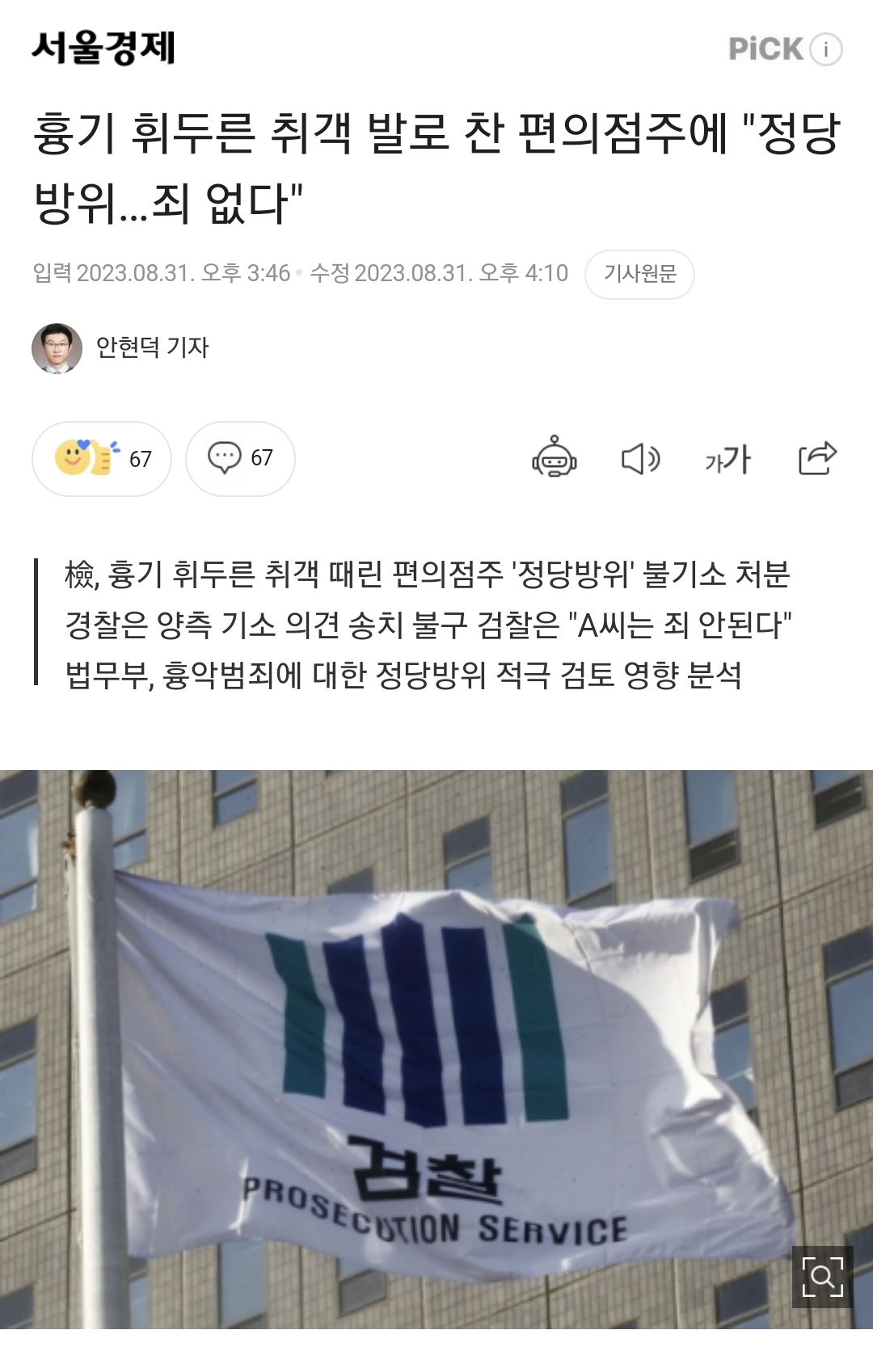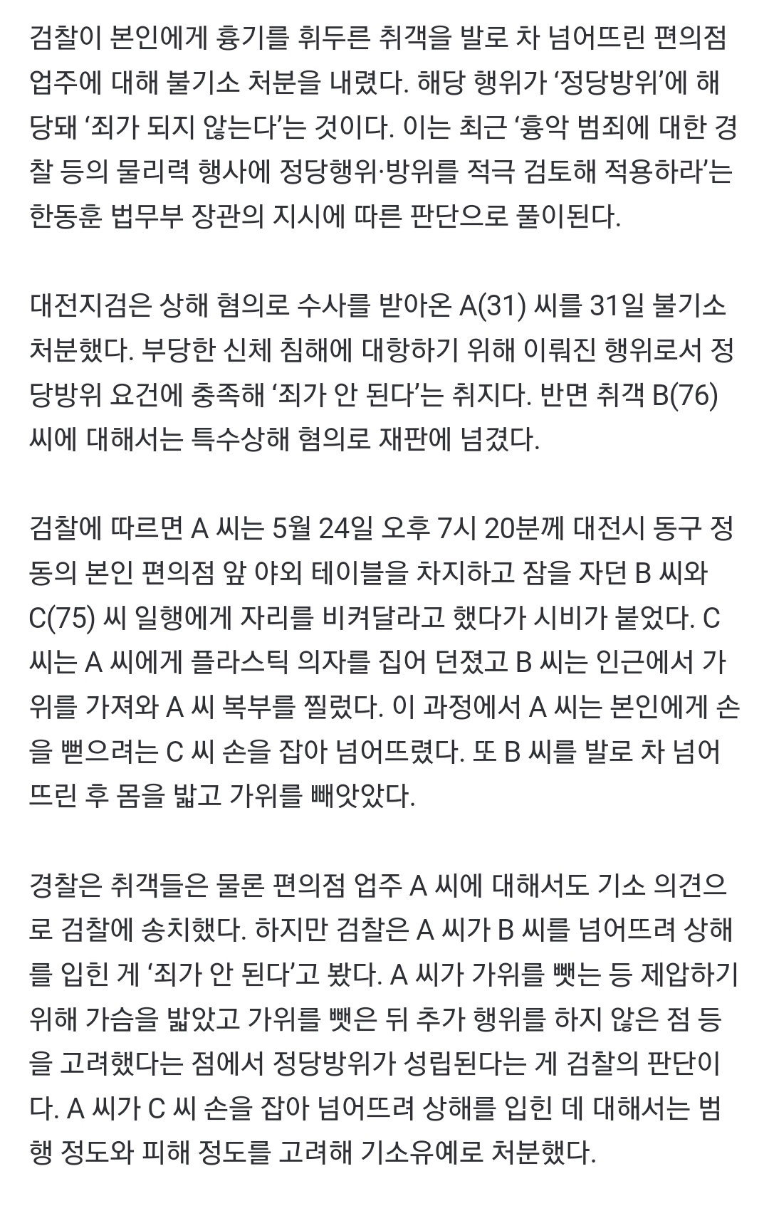 경찰은 정당방위 인정 안하고 검찰에 송치했는데 검찰은 정당방위 인정해서 불기소