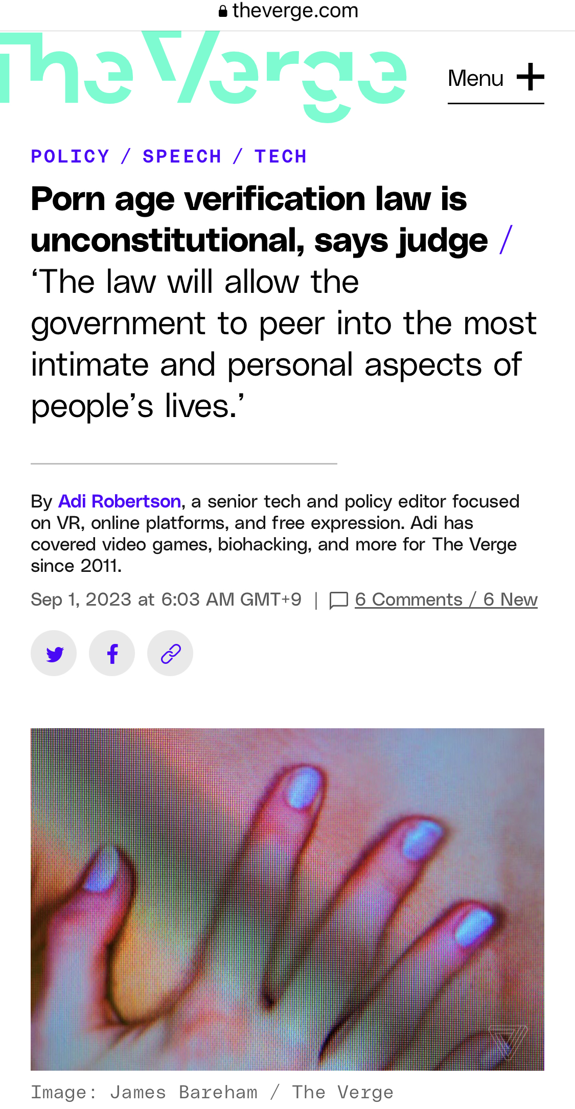 최근 텍사스 주를 비롯해 몇몇 주에서는 포르노가 업로드되는 성인용 웹사이트에 접속시, 정부에서 발행한 운전면허증 등 성인임을 인증해야 접속이 가능하도록 하는 법안을 통과시켰는데, 그러나 미국 연방 법원은 이것이 위헌이라는 판결을 내림