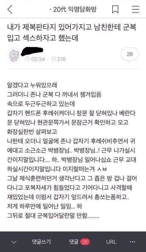 내가 제복판타지가 있어서 남친한테 군복입고 ㅅㅅ하자고 했는데