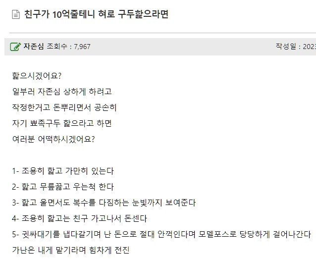 친구가 10억 줄 테니 혀로 구두 핥으라고하면