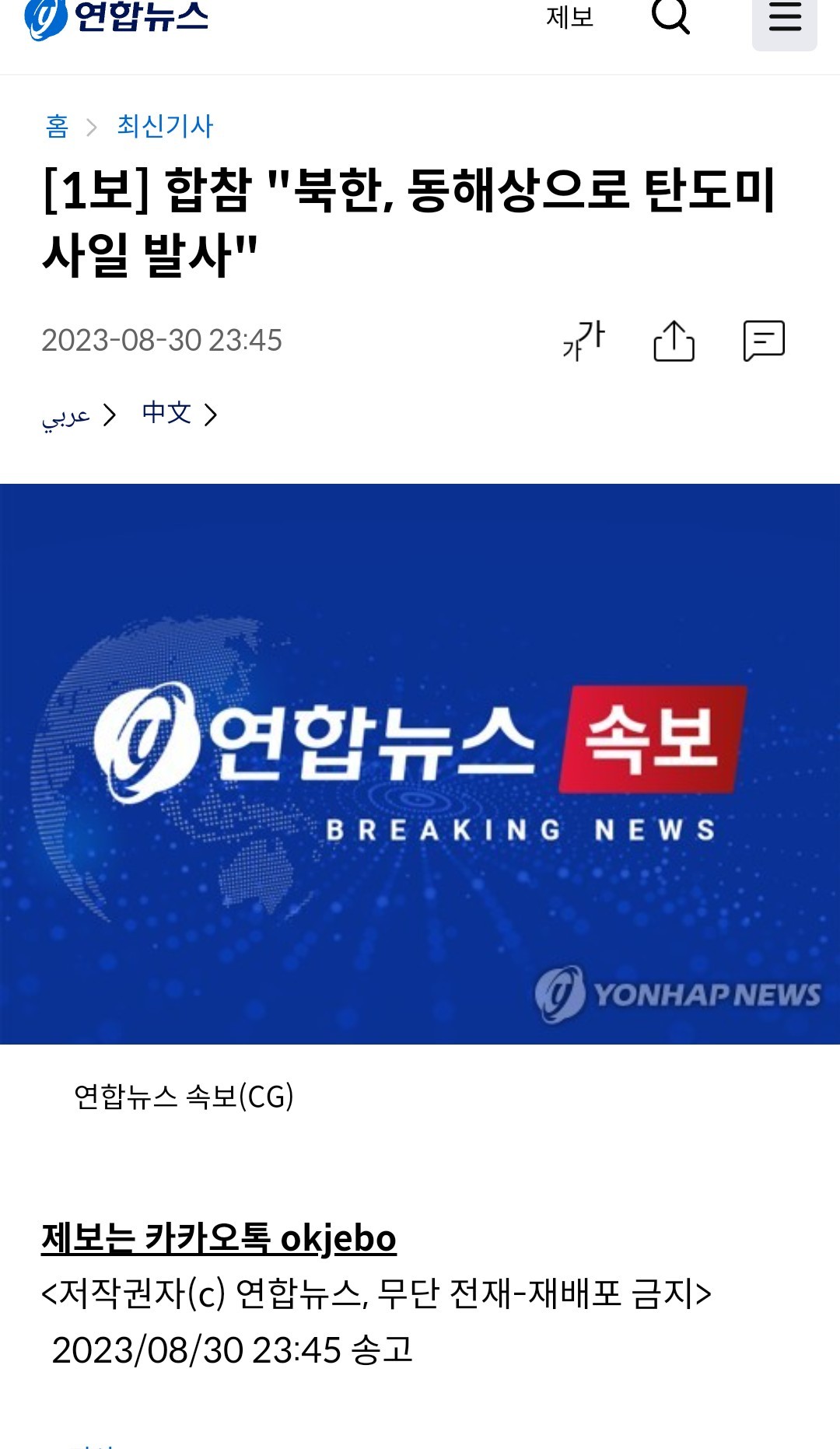 합참 "북한, 동해상으로 탄도미사일 발사"