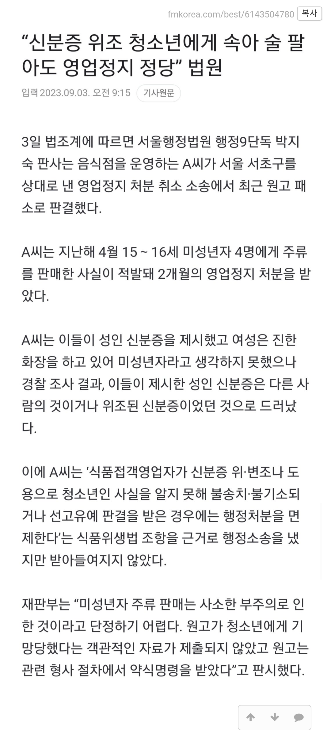 “신분증 위조 청소년에게 속아 술 팔아도 영업정지 정당” 법원