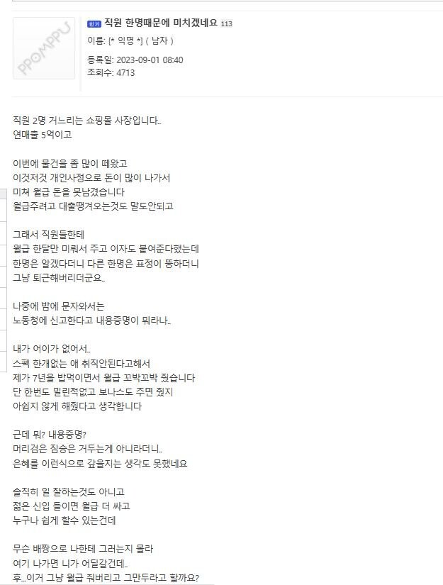 월급 한달 미룬다니 노동청에 신고하겠다는 직원