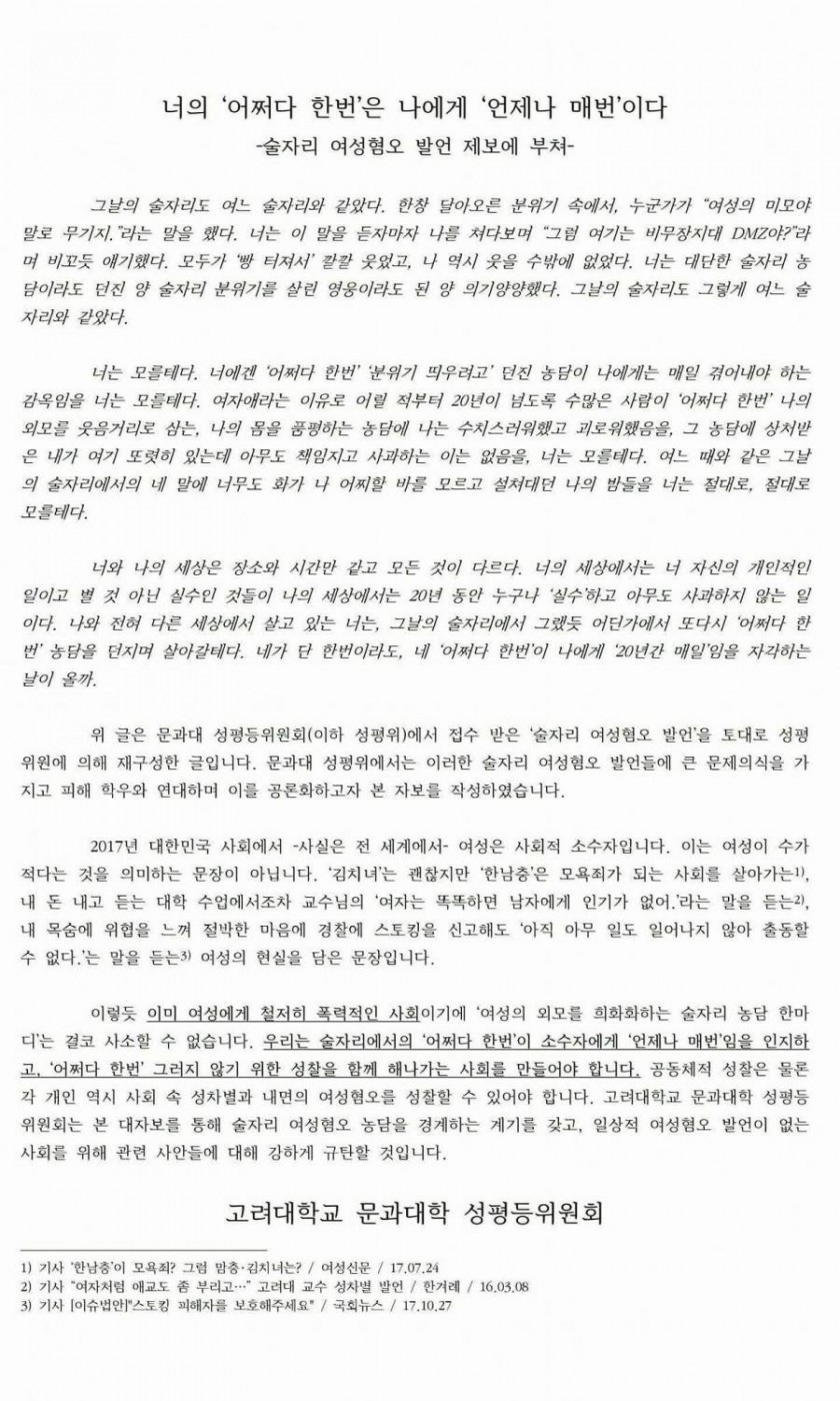 2017년 고려대커뮤니티에 올라온 술자리썰.