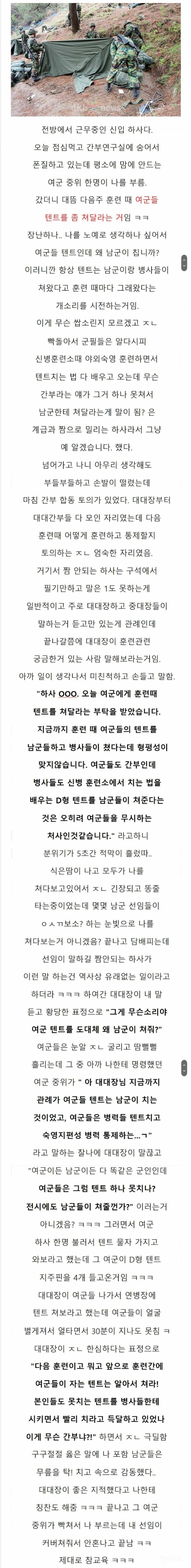 텐트 대신 쳐달라는 여군 장교 참교육