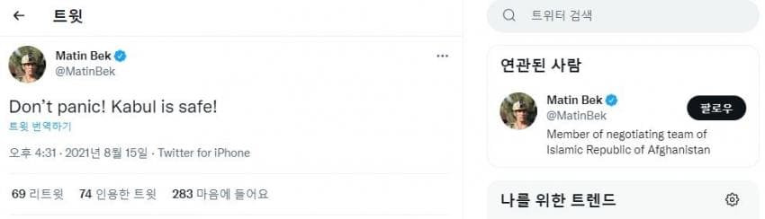 아프칸 대통령궁 비서실장: 국민여러분 안심하십시오
