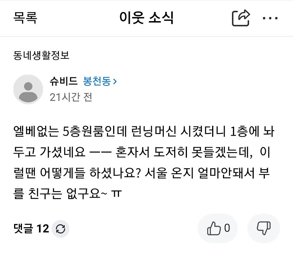 5층 원룸인데 런닝머신 시켰더니 1층에 놔두고 가셨네요.