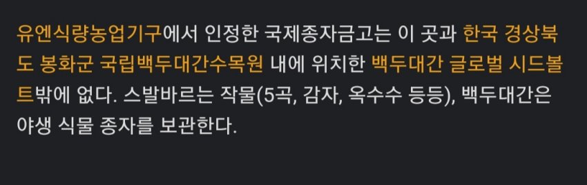 하나는 그 유명한 노르웨이에 있는 스발바르 시드볼트고 나머지 하나는 한국에 있는 백두대간 시드볼트임