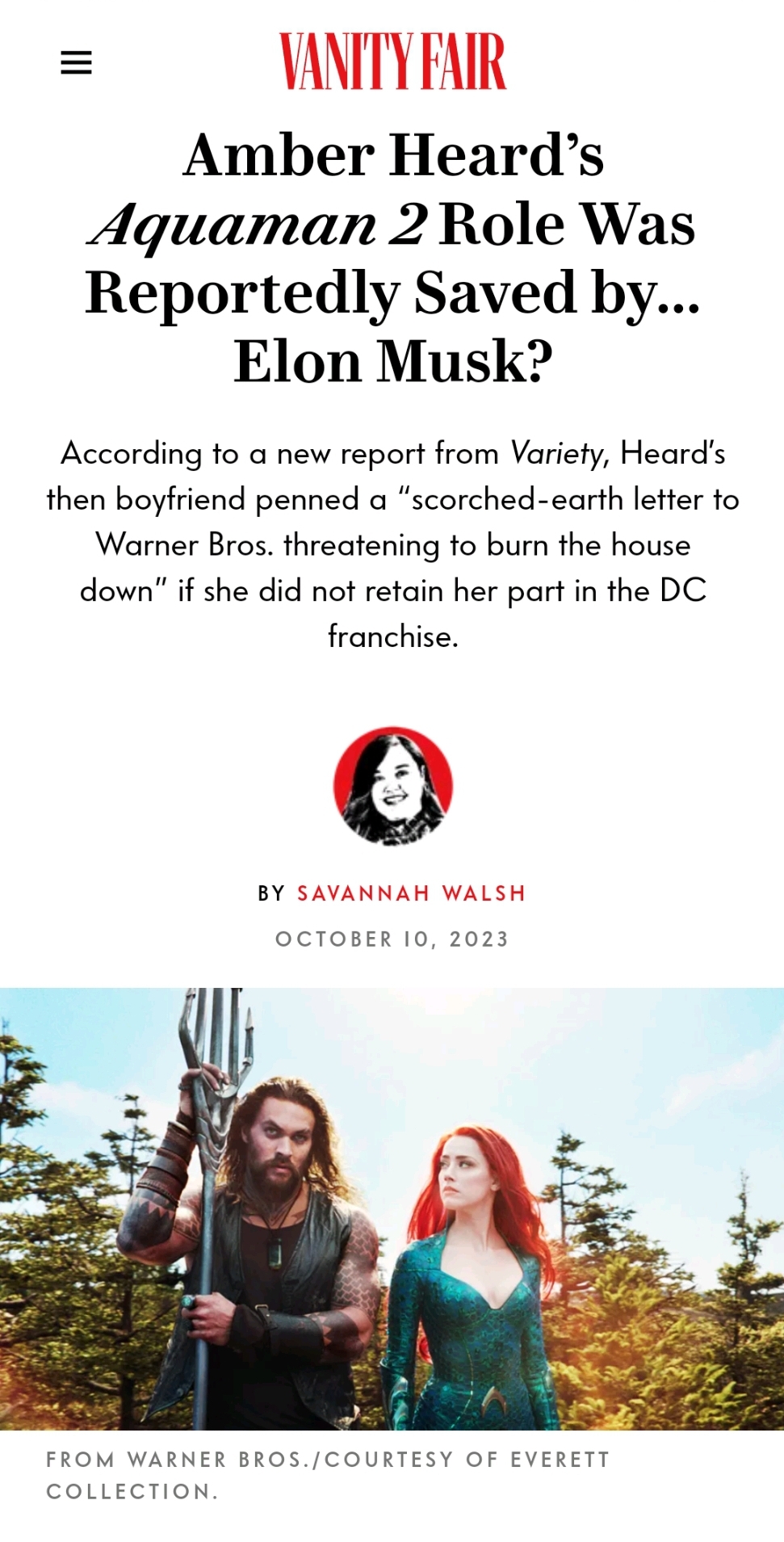 아쿠아맨 2에서 엠버 허드를 메라 역에서 하차시킨다면 워너브라더스 회사를 불태워버리겠다는 분노의 편지를 써서 보냈다고