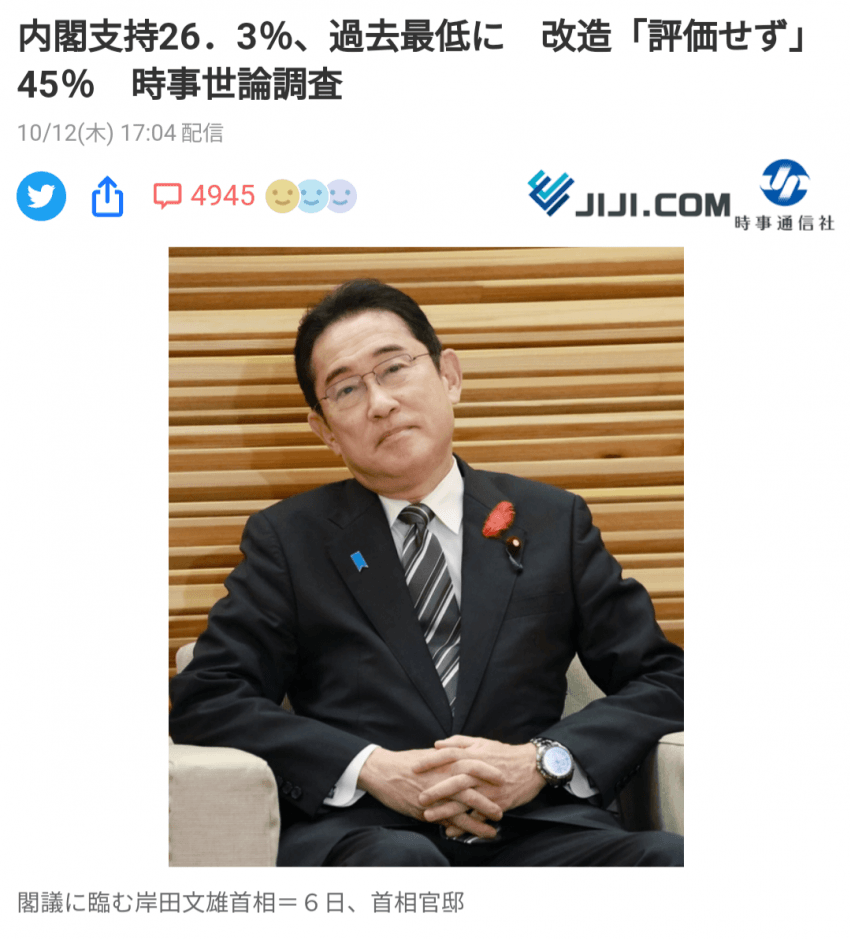 지지통신이 6~9일에 실시한 10월 여론조사에 따르면 기시다 내각