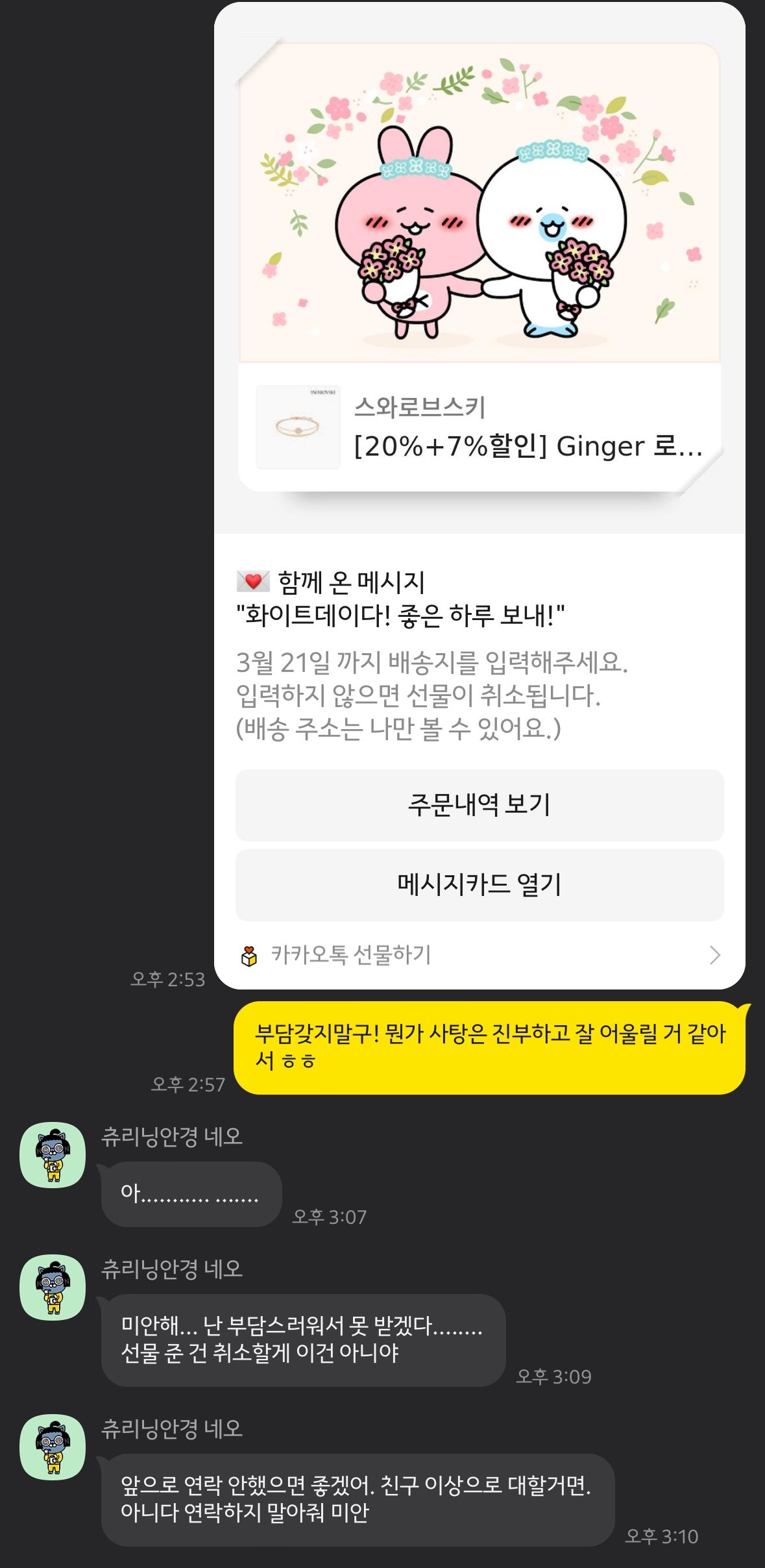 짝녀에게 화이트데이 선물로 팔찌 줬다가 까인 카톡