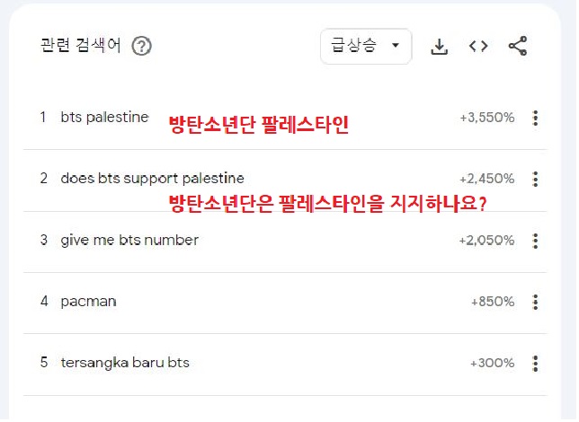 중동 현지에서 BTS가 팔레스타인 지지하는지 여부에 대한 관심도가 폭발적으로 늘고 있음