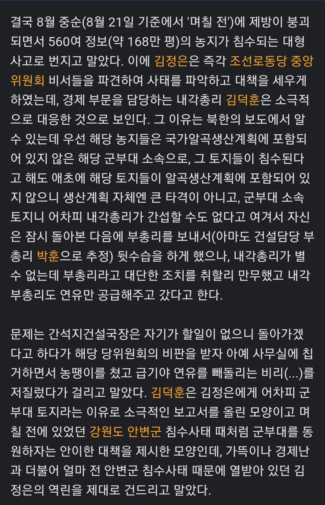 김정은: 야 총리야 지방에 농지 침수됐다는데 니가 노동당 비서들이랑 가서 상황좀 해결하고 와라