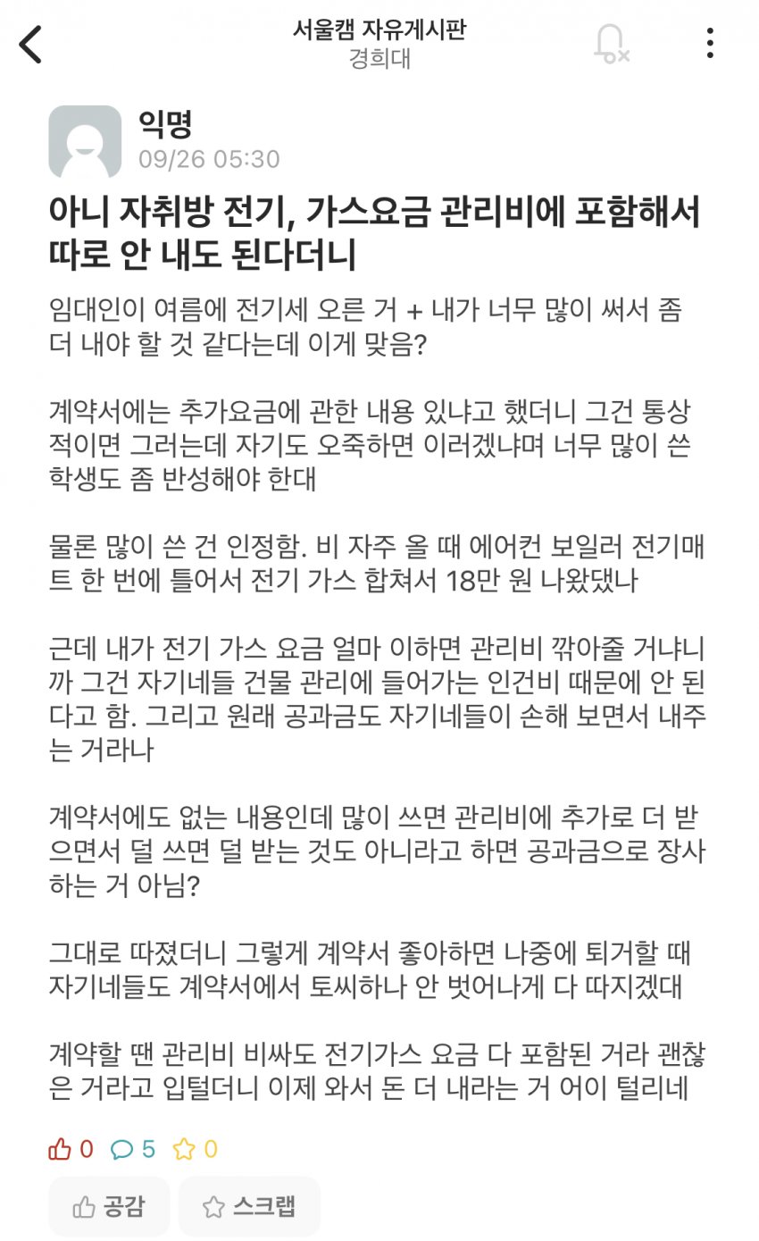 월세에 전기요금 가스요금 포함 & 추가비용 얘기 없이 계약함