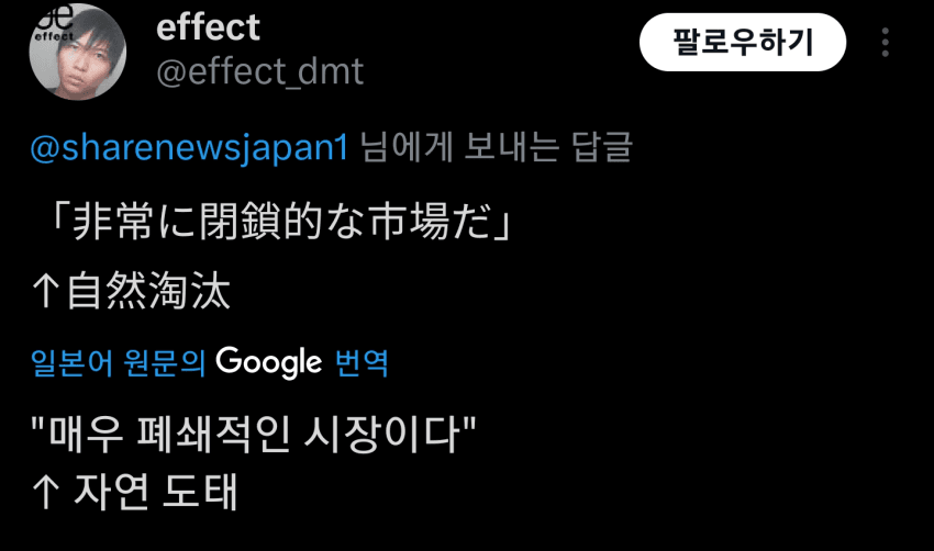 해당 발언을 들은 어느 일본인은 "폐쇄적인 시장"을 언급하면서 자연도태 되었다는 댓글이 배댓먹음